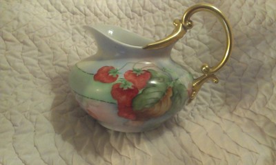 Antique Pitcher. Strawberry pattern. Signed and Dated. Gold Handle
