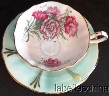 Title (ebay affiliate link): Queen Anne English Tea Cup and Saucer Frilly Pink Carnation HPT Gilt Blue Teacup