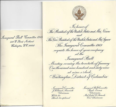 Title (ebay affiliate link): 1969 NIXON & AGNEW ENGRAVED INAUGURAL BALL INVITATION w/ ENVELOPE