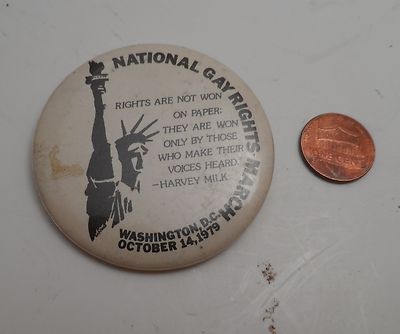 Title (ebay affiliate link): 1970's NATIONAL GAY RIGHTS MARCH OCT 14 1979 Button Pinback Badge Pin