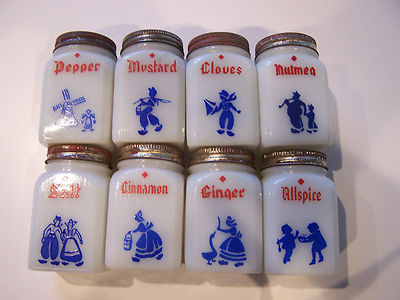 Title (ebay affiliate link): Set of 8 VTG Dutch McKee Milk Glass Spice Range Jar Salt Pepper Shakers USA 1940
