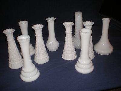 Title (ebay affiliate link): STYLISH LOT OF 10 VINTAGE SHORT WHITE MILK GLASS BUD VASES - VARIOUS DESIGNS