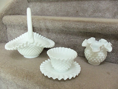 Title (ebay affiliate link): WHITE MILKGLASS HOBNAIL FENTON BASKET VASE PLANTER/BOWL DISH SAUCER RUFFLE EDGE