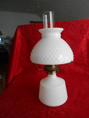 Title (ebay affiliate link): Vintage White Milk Glass Oil Lamp White Hobnail Globe 17''
