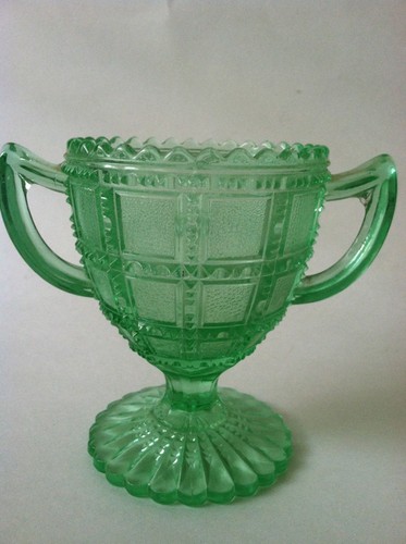 Title (ebay affiliate link): Vintage GREEN Cut Glass Double Handle Open Sugar Bowl Dish Cup