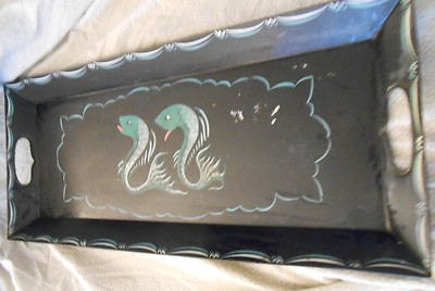 Title (ebay affiliate link): Vintage black metal folk art tray hand painted fish design made in MA 22"X9 1/2"