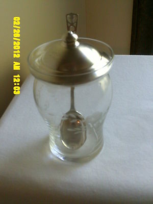 Antique etched glass jelly jar with sterling silver lid and spoon