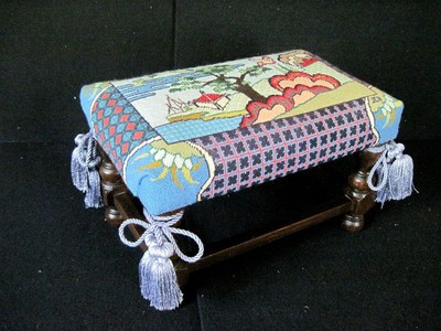 Title (ebay affiliate link): Vintage Wooden Footstool ~ Imari Plate Needlepoint Cover ~ Tassels ~ Excellent!