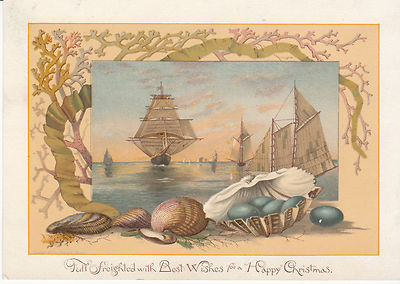 Antique Victorian Christmas Card Schooners in a bay with Shells circa 1880