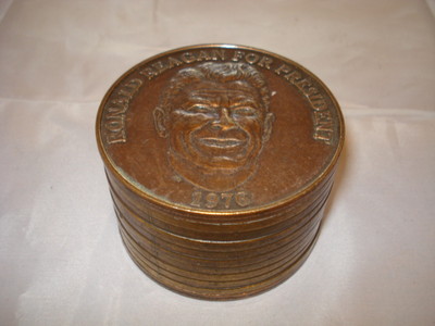 Title (ebay affiliate link): Ronald Reagan for President 1976 Metal Bank Coin Shaped EUC Slogan