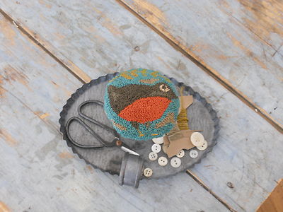 Title (ebay affiliate link): PRIMITIVE FOLK ART-PUNCH NEEDLE-NOTFORGOTTEN FARM-NEEDLE BIRD PINKEEP/TIN BASE