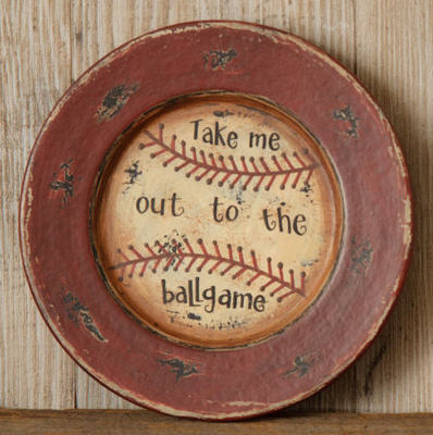 Title (ebay affiliate link): PRIMITIVE~ BASEBALL WOOD PLATE ~TAKE ME OUT TO THE BALL GAME DECOR~NEW~