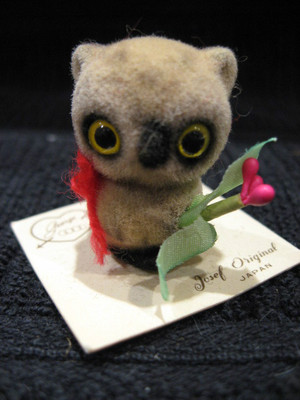 Vintage Josef Originals Fuzzy Mini Owl Figurine Flocked Pottery On the Card