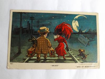 Title (ebay affiliate link): BROKE END OF HONEYMOON COUPLE ON TRAIN TRACKS VINTAGE JULIUS BIEN 1913 POSTCARD
