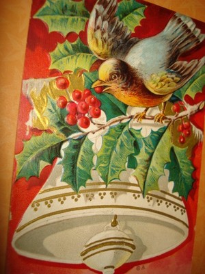 Title (ebay affiliate link): A. JAEGER Old Holiday Christmas postcard Bird on Holly Branch Large Bell icicles