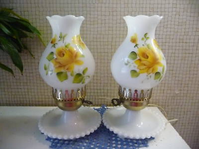 VINTAGE Milk Glass Table Lamp Pair w Hand Painted Shade