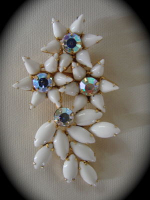 VINTAGE LARGE 3" MILK GLASS & AB RHINESTONE BROOCH A+