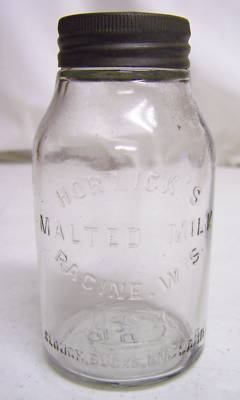 VINTAGE HORLICK'S MALTED MILK EMBOSSED JAR W/ ZINC LID