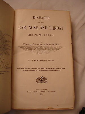 Title (ebay affiliate link): Antique Medical Book "Diseases of the Ear, Nose, and Throat " Phillips 1913