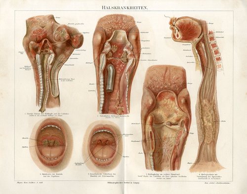 1887 ANATOMY HUMAN NECK MOUTH DISEASES Antique Chromolithograph Print