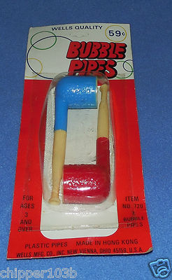 Title (ebay affiliate link): VINTAGE COLORFUL PLASTIC BUBBLE PIPES - 1960'S - WELLS MFG. - MIP