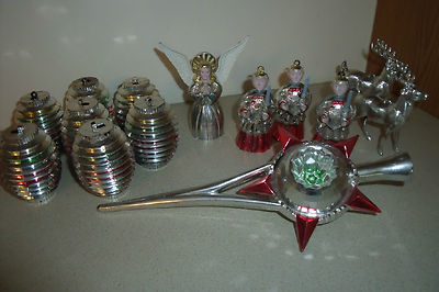 Title (ebay affiliate link): Vintage 14pc 1950's Hard Plastic Ornament Set w/ Tree Top Choir Angel Reindeer
