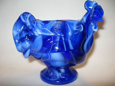 Cobalt blue milk slag glass hen / chicken egg cup toothpick holder dish rooster