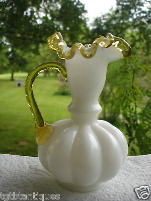 VINTAGE FENTON ? ART GLASS MELON PITCHER - MILK GLASS YELLOW CREST 5 1/4 INCH