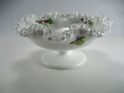 Title (ebay affiliate link): Vintage FENTON Violets in the Snow Milk Glass Silver Crest Footed Comport Bowl