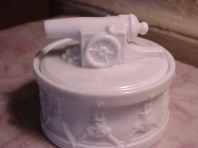 Title (ebay affiliate link): LOVELY MILK GLASS POWDER VANITY BOX Cannon & Drum PATTERN American Revolution