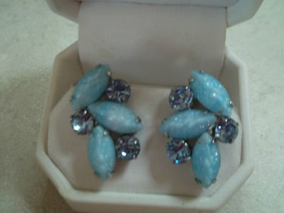 Title (ebay affiliate link): VINTAGE BLUE-ISH MILK GLASS & RHINESTONE CLIP ON EARRINGS SIGNED WEISS 1950S.
