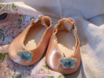 Title (ebay affiliate link): ANTIQUE/VTG PINK SATIN DOLL SHOES WITH VELVET TOE FLOWER~1 1/4" X 2 1/4"