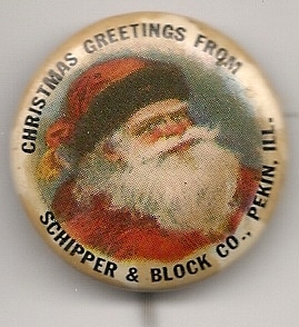 Santa Claus Christmas Greetings From Schipper & Block Co Pekin IL pinback button