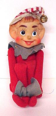 Title (ebay affiliate link): Large Red Felt Christmas Elf, Pixie, Striped Hat, Pointed Nose, BELL Knee Hugger