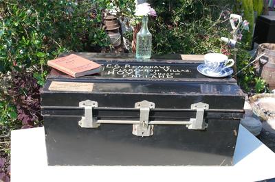 Title (ebay affiliate link): Antique Trunk Metal Chest, Vintage Coffee Table, Blanket Box Rustic Chic Toy Box