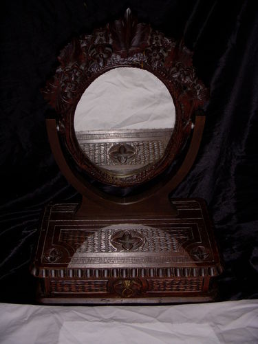 Title (ebay affiliate link): Vintage Wooden Dresser Top Vanity Carved Flowers Leaves Mirror Drawer 19"