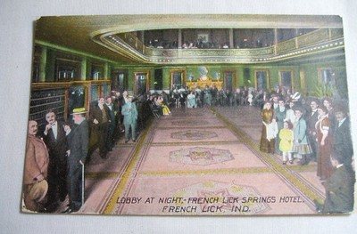 Title (ebay affiliate link): VINTAGE COLOR VIEW "LOBBY AT NIGHT, FRENCH LICK SPRINGS HOTEL, FRENCH LICK,IND."
