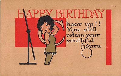 Title (ebay affiliate link): Old Comic Birthday Motto Postcard-Lady Admiring Herself in Mirror-Cheer Up!-1512