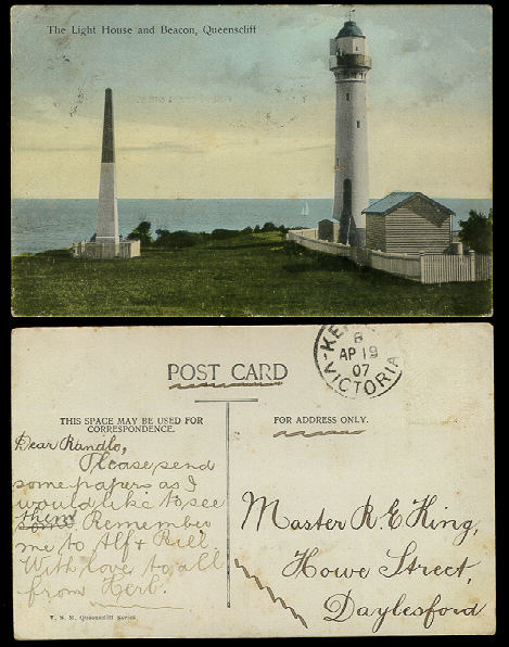 1907 Postcard - The Lighthouse & Beacon, Queenscliff, Victoria, Australia