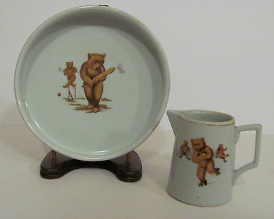 Title (ebay affiliate link): Antique TEDDY BEAR playing CRICKET Bowl & TEDDY BEARS - ROLLER SKATING Pitcher