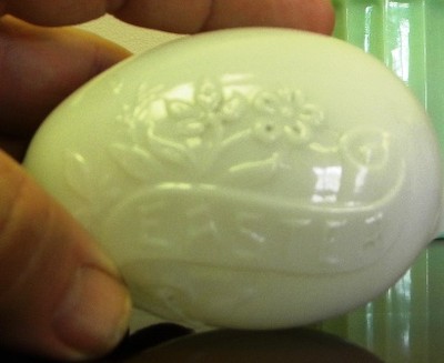EGG # 15; ANTIQUE HAND MADE MILK GLASS EASTER EGG EMBOSSED EASTER SCROLL FLOWERS