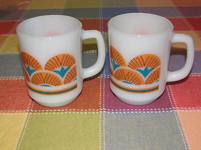 Title (ebay affiliate link): RARE 2 ANCHOR HOCKING/FIRE KING MILK GLASS MUGS GOLD/BLUE FAN DESIGN