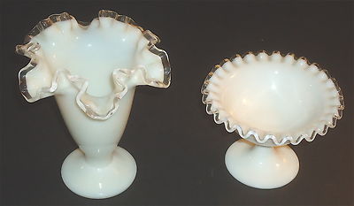 LOT of (2) EARLY Vintage MILK GLASS RIBBON TOP PIECES~VASE & PEDESTAL BOWL! NR!