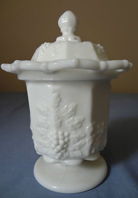 Title (ebay affiliate link): WESTMORELAND PANELED GRAPE LIDDED CANDY DISH-LACY EDGE MILK GLASS