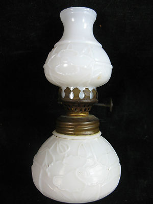 Title (ebay affiliate link): Antique Miniature Milk Glass Floral Oil Lamp. Matching Milk Glass Chimney Works