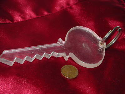 vintage 1960s -CLEAR-PLASTIC KEY CHAIN-SHAPED LIKE BIG KEY-HONG KONG-W/KEY RING