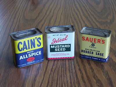 Title (ebay affiliate link): 3 VINTAGE SPICE TINS IDEAL MUSTARD SEED SAUER'S SAGE CAIN'S ALLSPICE