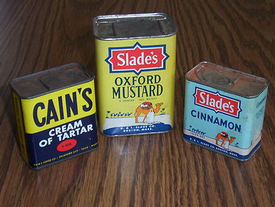Title (ebay affiliate link): 3 VINTAGE SPICE TINS CAIN'S CREAM OF TARTAR SLADE'S CINNAMON & OXFORD MUSTARD