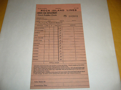 Rock Island Lines Railroad Diner Check, unused