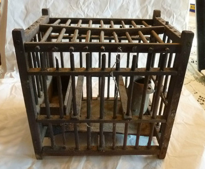 Antique Coal Mine Canary Bird Cage with Stoneware water bowl, primitive